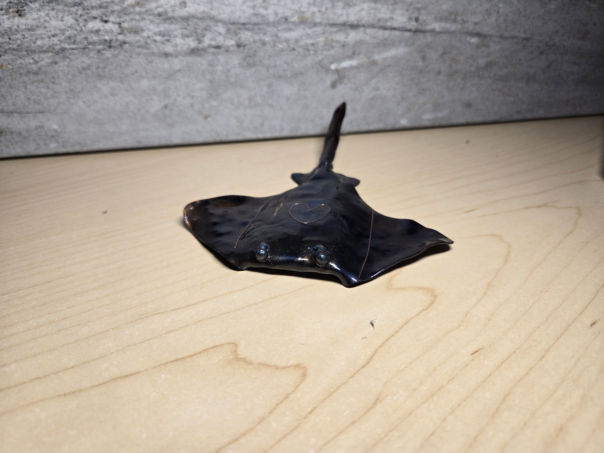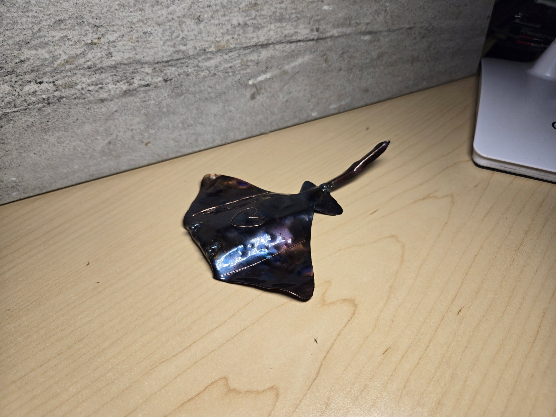 Hand formed from 20ga steel ,colored using heat and the natural properties of the steel, this small bottle opener (approximately 4x4 inches) makes a very pretty gift for the sea creature lovers out there. Each manta has a unique copper inlay .